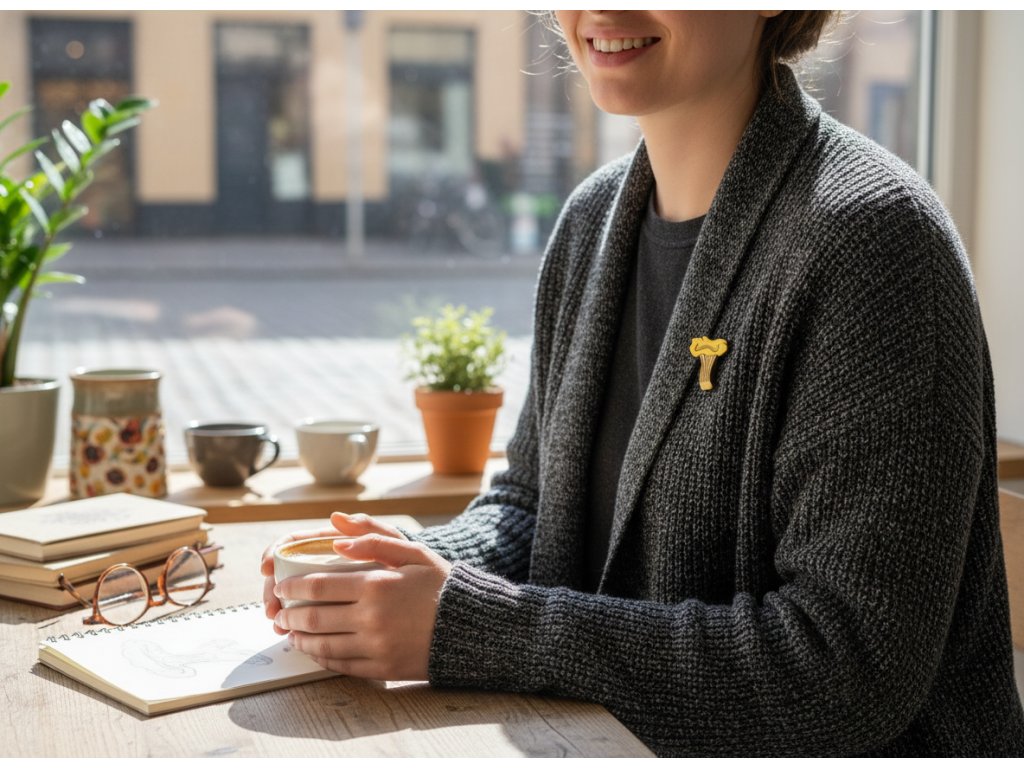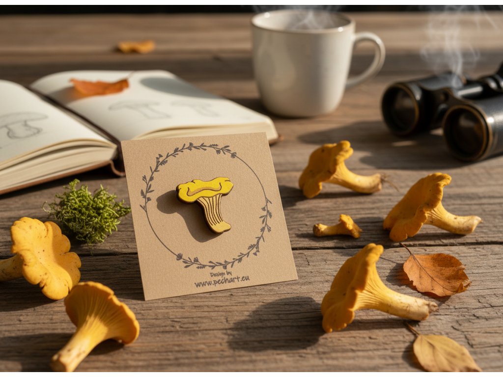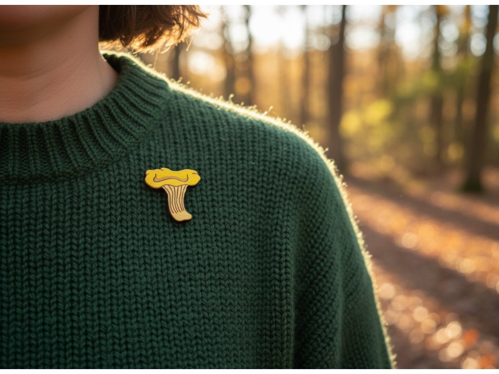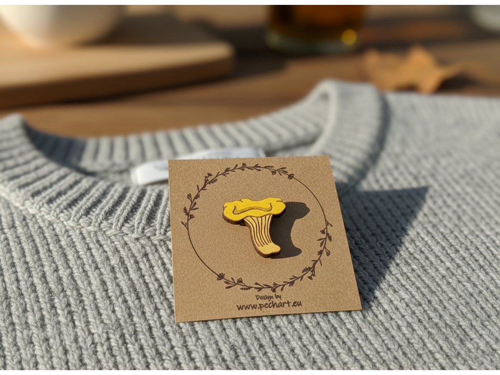 Ručně malovaná dřevěná brož s houbovým motivem.