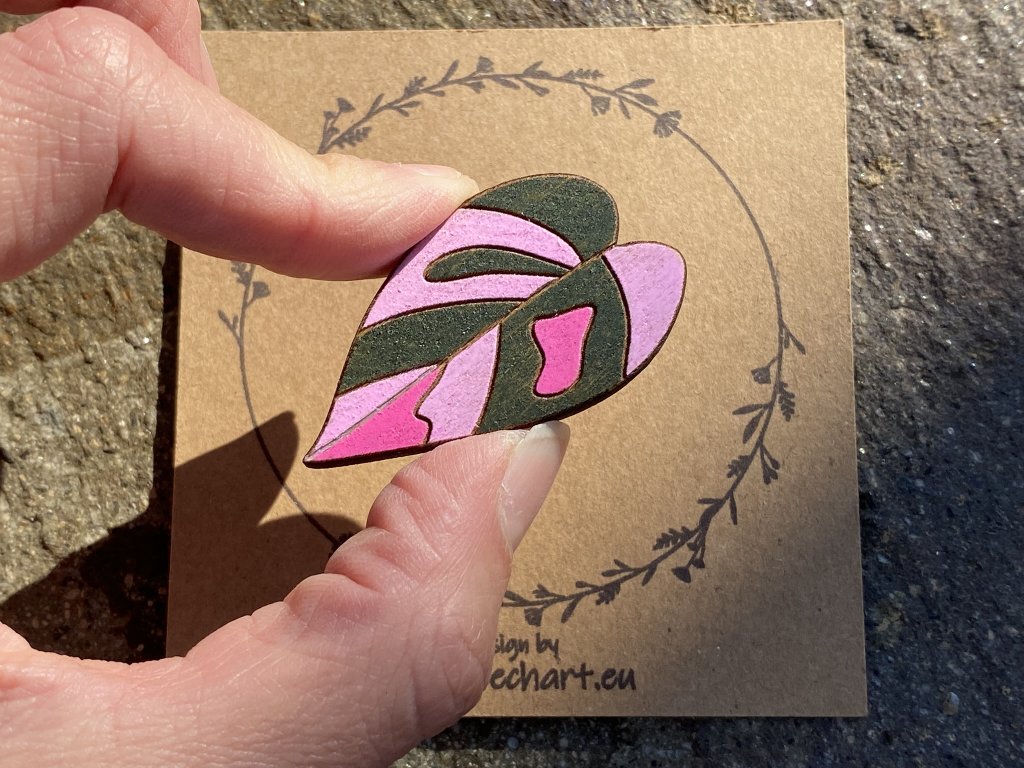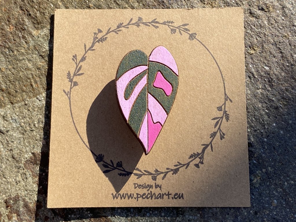 Ručně malovaná dřevěná brož s motivem pokojové rostliny - raritní Monstera deliciosa Thai Constellation.