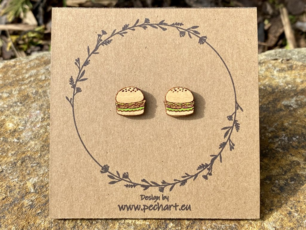 Ručně malované dřevěné náušnice s motivem burgerů.